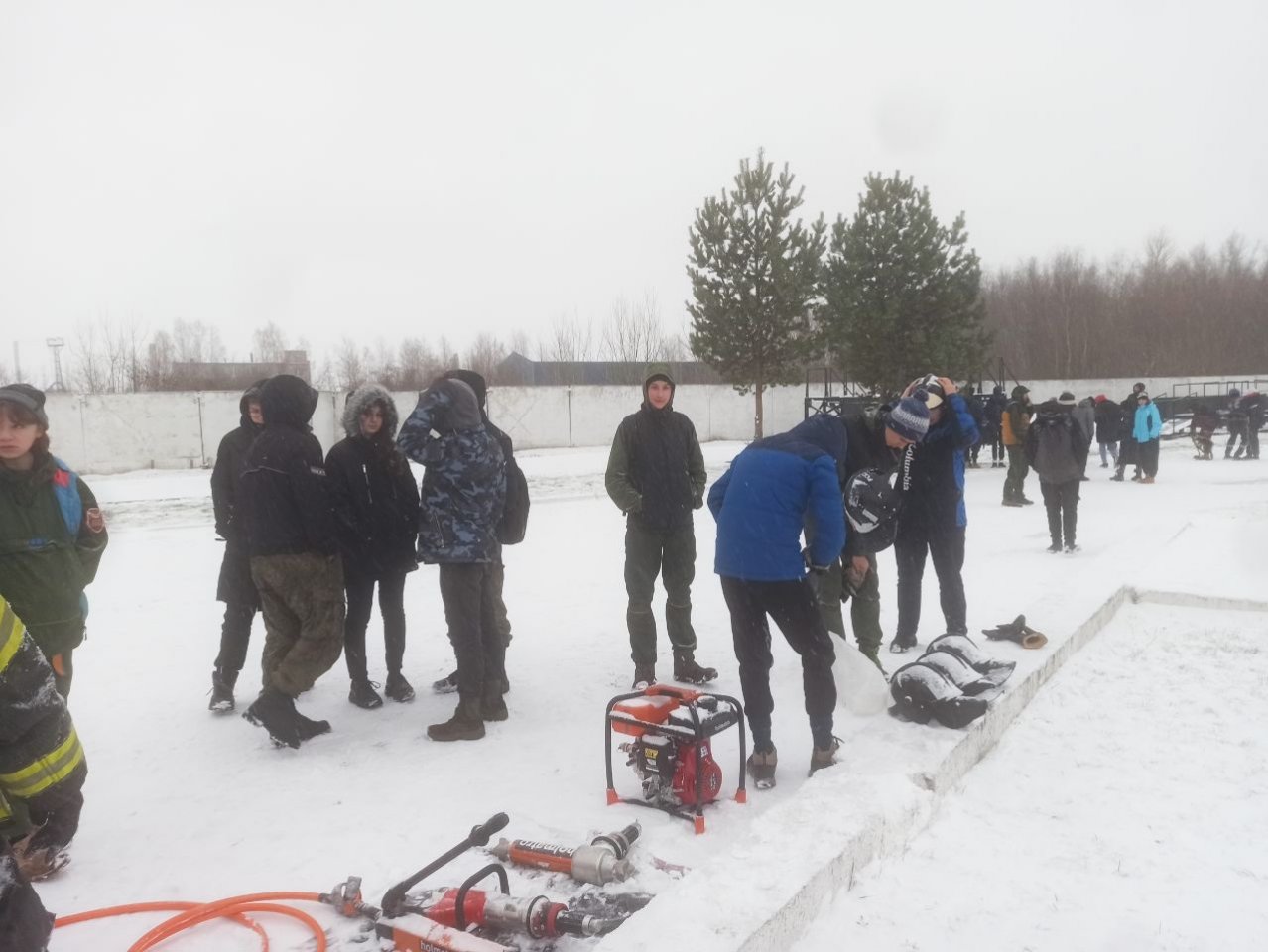 Не смотря на холод и небольшую метель, мальчишки и девчонки вместе со спасателями тушили пожар, спускались с третьего этажа условно горящего здания, учились пользоваться мощным гидравлическим инструментом, проползали по «переправе» и конечно, оказывали первую помощь пострадавшим.