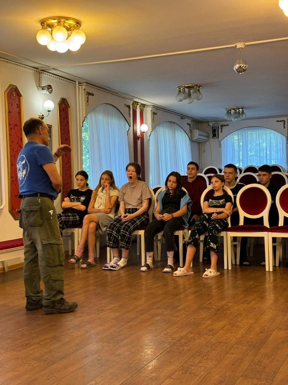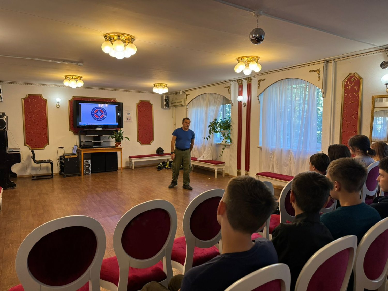 В этот раз к 24 подросткам приехал заслуженный спасатель РФ Шутов Михаил Юрьевич, посмотрели видео-ролик о работе спасателей и провели тест на выявление лучших.