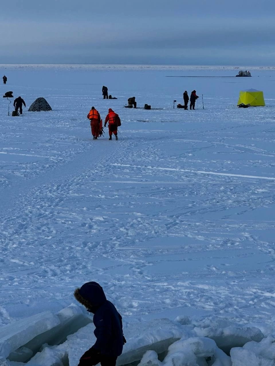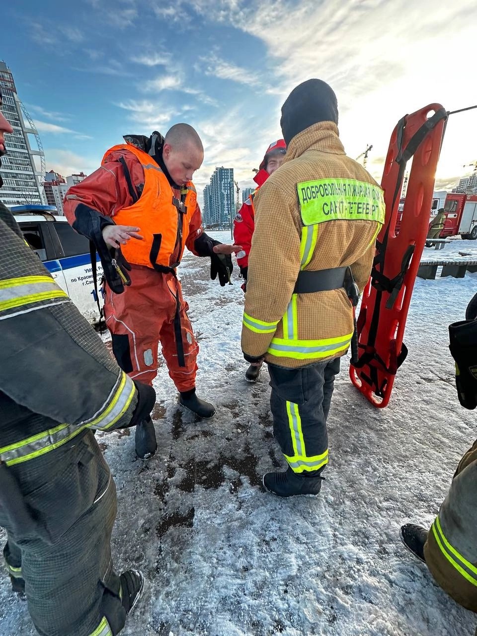 2) Человек провалился под лед на Финском заливе. В гидрокостюмах направились на разведку. Мужчина погиб. Извлекли из воды водолазы ПСС.