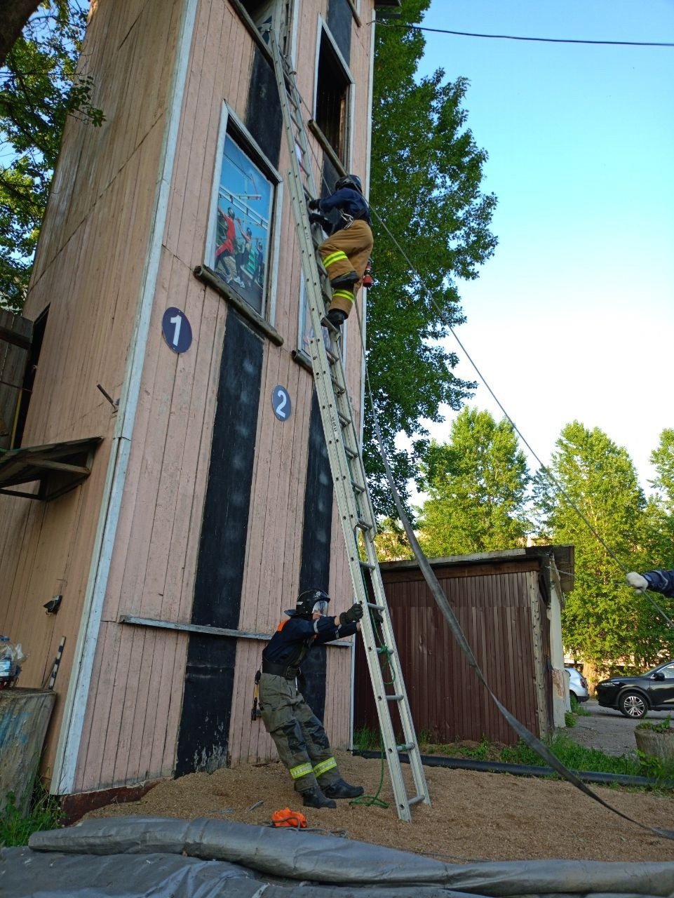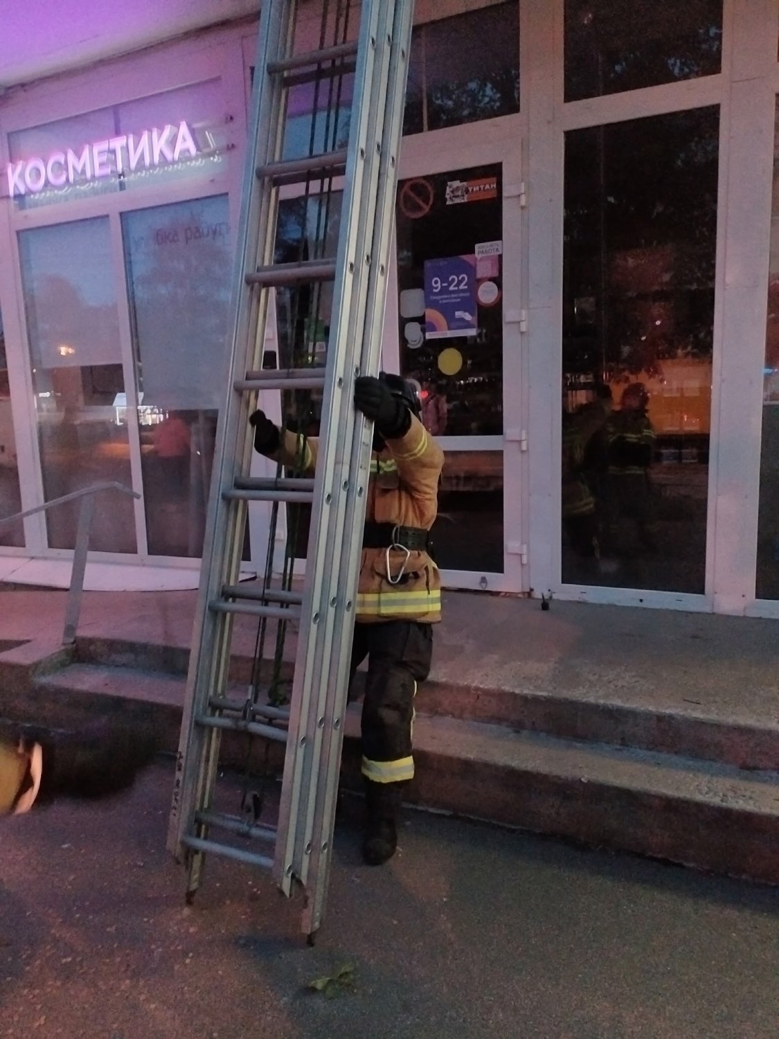 За сутки привлекались к выездам 3 раза: 1) Пожар. Горела вентиляционная труба на кухне хинкальной. Подали один ствол Б на тушение от АЦ 35 ПСЧ. Возгорание было ликвидировано, помещение кухни проветрено. 2) Провал грунта и парение из-под асфальта. Провели разведку, обнаружили провал асфальта в глубину на метр. Огородили опасное место. Вызвали к месту теплосеть. 3) Кот упал на козырек здания. Встретились с заявителем, уточнили обстановку. Установили трехколенную лестницу на козырек, сняли кота и передали заявителю. Кот не пострадал. В свободное время от вызовов отрабатывали норматив по установке трехколенной лестницы на учебную башню в окно 3го этажа, а также боевое развёртывание с подачей 1го ствола Б.